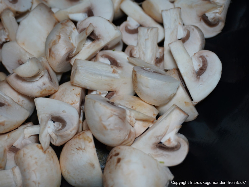 Steg champignon ved høj varme uden at røre de første 2–3 minutter, til de tager farve og afgiver væde.